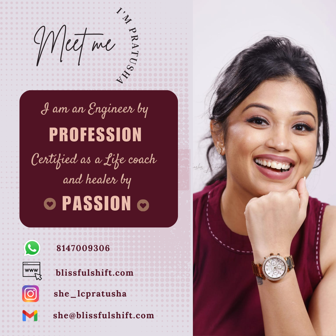 Hi, I’m Pratusha, an engineer by profession and a certified life coach and healer by passion. My mission is to empower individuals of all ages to take charge of their lives, build emotionally strong and intelligent minds, and elevate every aspect of their life journey. I specialize in cultivating self-confidence, setting healthy boundaries, and managing challenges such as relationship issues, parenting struggles, work-life balance, past trauma, grief, and much more. Together, we’ll turn obstacles into growth, fuel your motivation, and build resilience so you can pursue your dreams and goals.